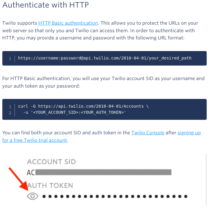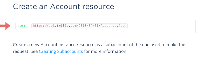 POSThttps://api.twilio.com/2010-04-01/Accounts.jsonSobre a autenticação, o Twilio apresenta exemplos de comandos e descreve os tipos de autenticação aceitos. Além disso, a documentação também explica onde e como obter as credenciais necessárias.