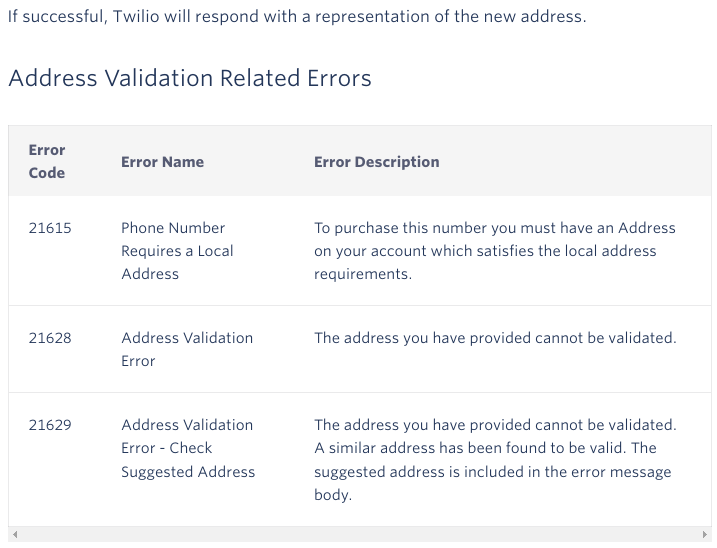 Para as respostas, o Twilio descreve o que é retornado quando a requisição é feita com sucesso e lista os códigos de erro. Perceba na imagem abaixo como, além dos códigos, o Twilio explica a causa do erro e o que precisa ser verificado para resolver.