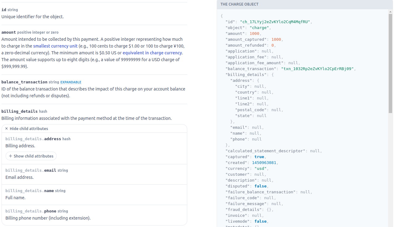 Por fim, a imagem abaixo mostra os parâmetros do Body de um request na documentação de APIs do Stripe. Ela lista, de duas maneiras diferentes, todos os parâmetros esperados pela API: uma lista descritiva com todos os atributos de cada parâmetro, e um bloco de código mostrando os mesmos parâmetros da forma como eles são estruturados dentro do protocolo HTTPS.